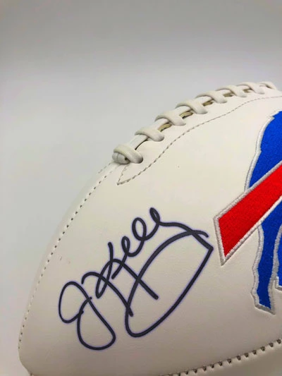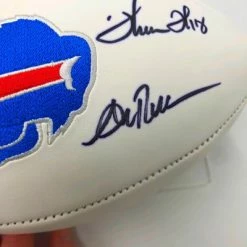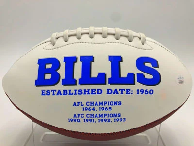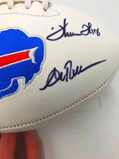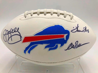 Mehrfach signierter Football mit Logo der Buffalo Bills von Wilson. Autogramme von Andre Reed, Thurman Thomas und Jim Kelly auf dem Football. Alle NFL Autogramme sind authentifiziert und verfügen über eine Seriennummer. Weitere Infos siehe unten.