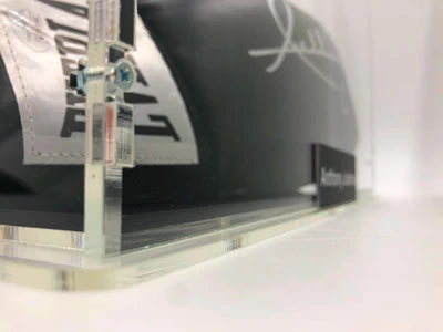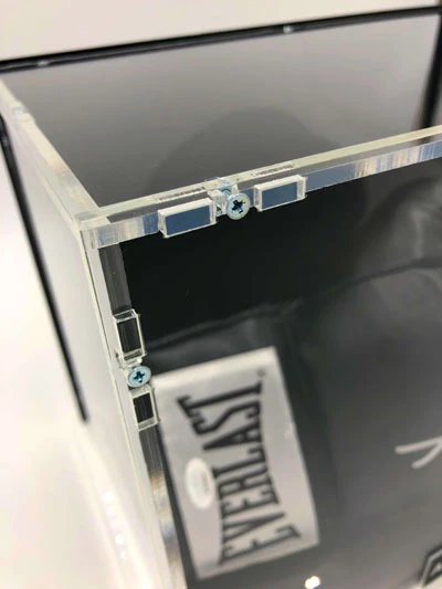 - Der Boxhandschuh kommt mit einem Boxing Showcase zu Ausstellungszwecken; das Showcase ist von massiver und robuster Qualität. Das Glas ist aus Acryl, der Boden und die Rückwand sind schwarz gehalten, um den Boxhandschuh ideal zur Geltung zu bringen. Das Showcase ist wertig verschraubt und schließt komplett. Das Name Plate an der Vorderseite ist aus Aluminium.