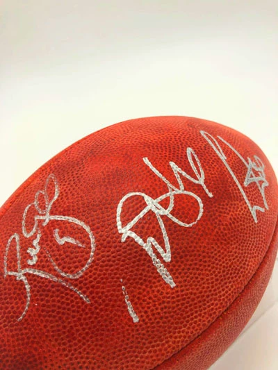 - Autogramme: Cris Carter (rechts), Mark Sanchez (Mitte) und Robbie Gould (links), silberner Farbstift