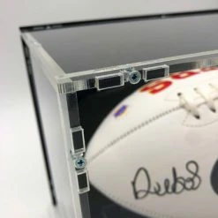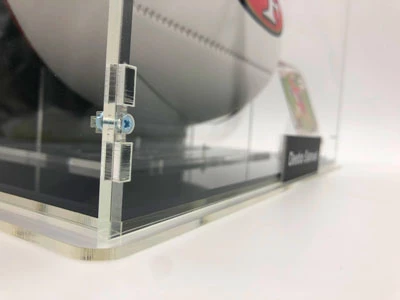 - Der Football kommt mit einem Football Showcase zu Ausstellungszwecken; das Showcase ist von massiver und robuster Qualität. Das Glas ist aus Acryl, der Boden und die Rückwand sind schwarz gehalten, um den Football ideal zur Geltung zu bringen. Das Showcase ist wertig verschraubt und schließt komplett. Der Ballhalter ist ebenfalls von massiver Qualität. Das Name Plate an der Vorderseite ist aus Aluminium.