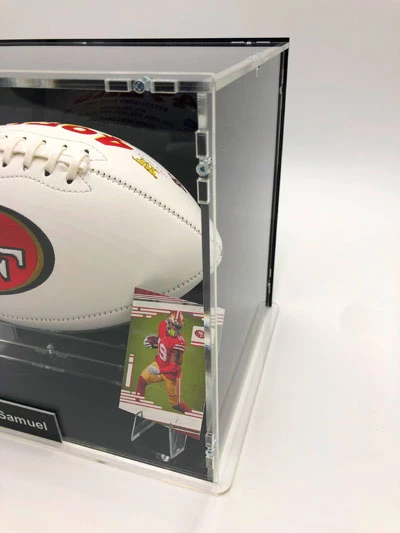 Football Showcase aus Sicherheitsglas. Signierter Football mit Logo der San Francisco 49ers von Rawlings im Case. Autogramm von Deebo Samuel auf dem Football. Alle NFL Autogramme sind authentifiziert und verfügen über eine Seriennummer. Weitere Infos siehe unten.