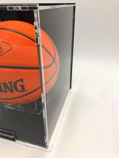 - Der Basketball kommt mit einem Basketball Showcase zu Ausstellungszwecken; das Showcase ist von massiver und robuster Qualität. Das Glas ist aus Acryl, der Boden und die Rückwand sind schwarz gehalten, um den Basketball ideal zur Geltung zu bringen. Das Showcase ist wertig verschraubt und schließt komplett. Der Ballhalter ist ebenfalls von massiver Qualität. Das Name Plate an der Vorderseite ist aus Aluminium.