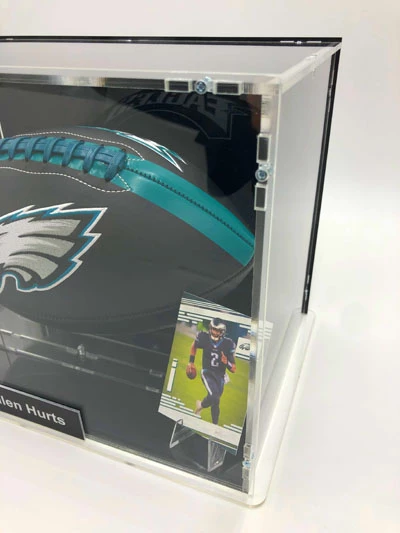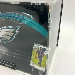 Football Showcase aus Sicherheitsglas. Signierter Football mit Logo der Philadelphia Eagles von Rawlings im Case. Autogramm von Jalen Hurts auf dem Football. Alle NFL Autogramme sind authentifiziert und verfügen über eine Seriennummer. Weitere Infos siehe unten.
