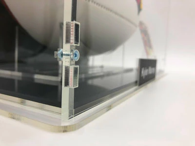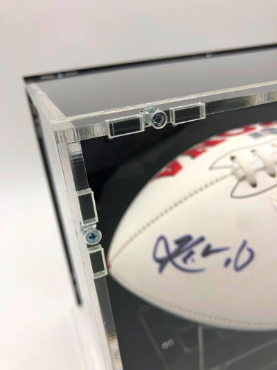 - Der Football kommt mit einem Football Showcase zu Ausstellungszwecken; das Showcase ist von massiver und robuster Qualität. Das Glas ist aus Acryl, der Boden und die Rückwand sind schwarz gehalten, um den Football ideal zur Geltung zu bringen. Das Showcase ist wertig verschraubt und schließt komplett. Der Ballhalter ist ebenfalls von massiver Qualität. Das Name Plate an der Vorderseite ist aus Aluminium.