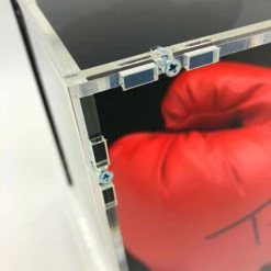- Der Boxhandschuh kommt mit einem Boxing Showcase zu Ausstellungszwecken; das Showcase ist von massiver und robuster Qualität. Das Glas ist aus Acryl, der Boden und die Rückwand sind schwarz gehalten, um den Boxhandschuh ideal zur Geltung zu bringen. Das Showcase ist wertig verschraubt und schließt komplett. Das Name Plate an der Vorderseite ist aus Aluminium.