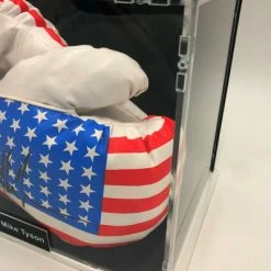 Boxing Showcase aus Sicherheitsglas. Boxhandschuhe von Defender U.S.A. im Case. Autogramm von „Iron“ Mike Tyson auf dem rechten Boxhandschuh. Alle Autogramme von Boxern sind authentifiziert und verfügen über eine Seriennummer. Weitere Infos siehe unten.