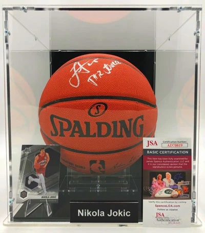 Basketball Showcase aus Sicherheitsglas. Signierter Basketball mit NBA Logo von Spalding im Case. Autogramm von Nikola Jokic auf dem Basketball. Alle NBA Autogramme sind authentifiziert und verfĂĽgen ĂĽber eine Seriennummer. Weitere Infos siehe unten.