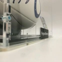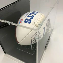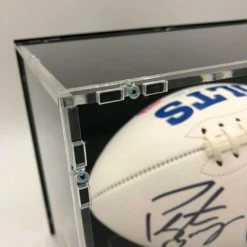- Der Football kommt mit einem Football Showcase zu Ausstellungszwecken; das Showcase ist von massiver und robuster Qualität. Das Glas ist aus Acryl, der Boden und die Rückwand sind schwarz gehalten, um den Football ideal zur Geltung zu bringen. Das Showcase ist wertig verschraubt und schließt komplett. Der Ballhalter ist ebenfalls von massiver Qualität. Das Name Plate an der Vorderseite ist aus Aluminium.