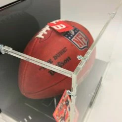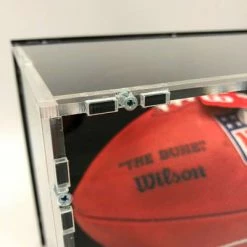 - Der Football kommt mit einem Football Showcase zu Ausstellungszwecken; das Showcase ist von massiver und robuster Qualität. Das Glas ist aus Acryl, der Boden und die Rückwand sind schwarz gehalten, um den Football ideal zur Geltung zu bringen. Das Showcase ist wertig verschraubt und schließt komplett. Der Ballhalter ist ebenfalls von massiver Qualität. Das Name Plate an der Vorderseite ist aus Aluminium.