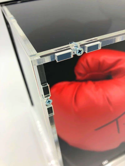 - Der Boxhandschuh kommt mit einem Boxing Showcase zu Ausstellungszwecken; das Showcase ist von massiver und robuster Qualität. Das Glas ist aus Acryl, der Boden und die Rückwand sind schwarz gehalten, um den Boxhandschuh ideal zur Geltung zu bringen. Das Showcase ist wertig verschraubt und schließt komplett. Das Name Plate an der Vorderseite ist aus Aluminium.